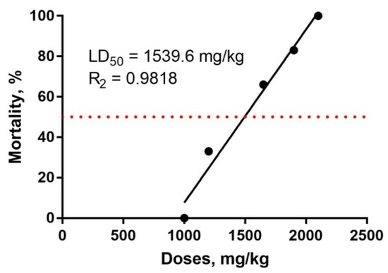 As the 2000 mg/kg dose caused 100% animal mortality within 24 h, the decision was made to reduce the dose to 1000 mg/kg. When it was found that the introduction of this dose did not cause mortality in the experimental animals during the observation period, a search was made for the average lethal dose between the indicated values. The LD50 was then calculated using linear regression and was determined at the level of 1539.6 mg/kg. These data allow us to classify compound 2b to the IV class of toxicity, being practically non-toxic (Figure 6).