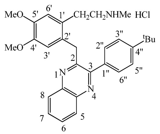 The starting compound was 2-(2-{[3-(3,4-dichlorophenyl)quinoxalin-2-yl]methyl}-4,5-dimethoxyphenyl)-N-methylethan-1-amine 1d. It was converted to hydrobromides by treatment with mixture of conc. HBr and EtOH. The yield was 89%. Colorless crystals with mp 186–187 °C (from EtOH). 1H NMR (600 MHz), DMSO-d6. δ, ppm: 2.51 (s, 3H, NMe), 2.78–2.75 (m, 2H, H-α), 2.97–3.08 (m, 2H, H-β), 3.51 (s, 3H, OMe), 3.73 (s, 3H, OMe), 4.39 (s, 2H, ArCH2Het), 6.38 (s, 1H, H-6′), 6.81 (s, 1H, H-3′), 7.71 (dd, J 8.2, 2.1, 1H, H-3″), 7.79 (d, J 8.2, 1H, H-2″), 7.82–7.87 (m, 2H, H-6, H-7), 7.90 (d, J 2.0, 1H, H-6″), 8.01–8.05 (m, 1H, H-8), 8.07–8.13 (m, 1H, H-5), 8.47 (s, 1H, +NH2). 13C NMR (150 MHz), DMSO-d6. δ, ppm: 28.36 (C-CH2-group of fragment CH2-CH2), 32.32 (NMe), 38.63 (ArCH2Het), 48.75 (N-CH2), 55.26 (OMe), 55.52 (OMe), 113.45 (C-6′), 113.93 (C-3′), 127.85, 128.26, 128.28, (C-3″,5″), 128.81 (C-5′), 129.39, 129.96, 130.50, 130.98, 131.12, 131.82, 139.07, 139.93, 140.61, 147.28, 147.43, 152.37, 154.19. Found (%): C 55.21; H, 4.25; Br + Cl, 26.48; N, 7.31. Calc. for C26H26BrCl2N3O2 (%): C 55.44; H, 4.65; Br, 14.18; Cl, 12.59; N, 7.46.