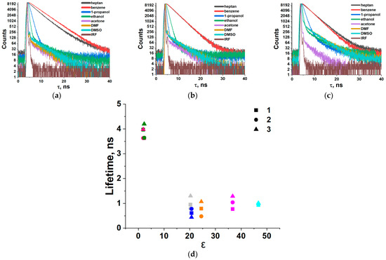 Time-resolved fluorescence decays of 1–3 in organic solvents (a–c) and the dependences of fluorescence lifetimes of 1–3 on organic solvent dielectric constant (d). ●—heptane; ●—benzene; ●—1-propanol; ●—ethanol; ●—acetone; ●—DMF; ●—DMSO.