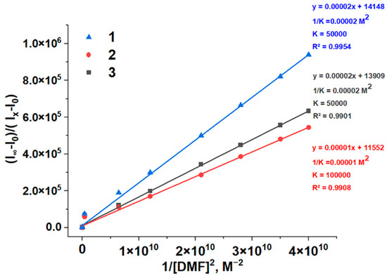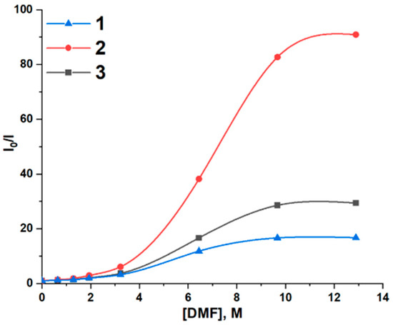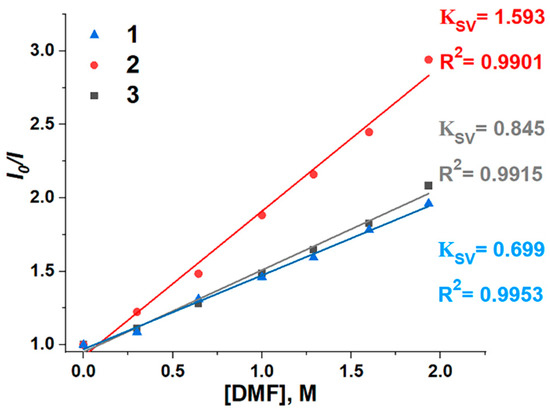 Stern–Volmer curves for fluorescence quenching of 1–3 (c = 2.0·10−6 mol/L) with the addition of various DMF concentrations.