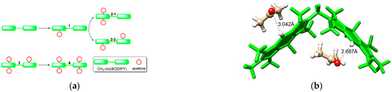 Schematic representation of the CH2-bis(BODIPY)·2acetone formation mechanism (a) and optimized structure of 3,3′-CH2-bis(BODIPY)·2acetone (b).