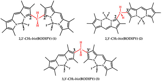 Chemical structures of BODIPY dimers (2,2′-, 2,3′-, 3,3′-CH2-bis(BODIPY) (1–3)).