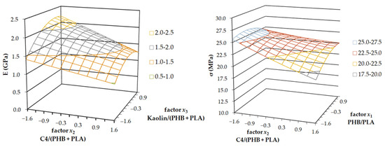 Experimental data were plotted in 3D wave graphs. The graphs show the dependence of the measured value on two statistically relevant DoE factors. The third, less relevant or even irrelevant factor was fixed at a constant level coded as 0. Equation (2) was used to plot the graphs. Parameters x1, x2, and x3, represent DoE factors, PHB/PLA, C4/(PHB + PLA), and Kaolin/(PHB + PLA) respectively.