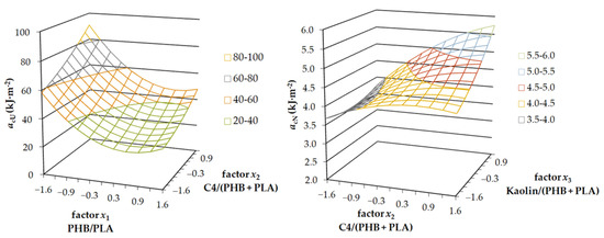 The plot for the notched Charpy impact test, which is illustrated in Figure 3b, is somewhat different than for the unnotched. In this case, the statistically relevant factors were x2 and x3. Factor x1 was not relevant and fixed on coded level 0. The value of notched impact strength (acN) increased non-linearly with the increasing content of the plasticiser. It also increased with the increasing content of kaolin particles. This effect was, however, more relevant for the higher content of plasticiser because of better dispersion of the particles in the plasticized matrix, which corresponded with slower crack propagation.