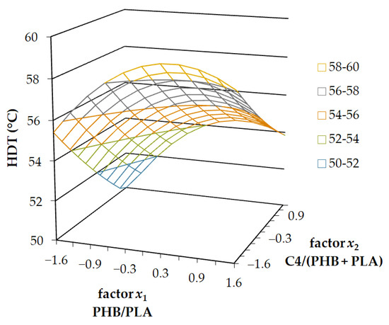 The Heat Deflection Temperature (HDT) Test reported all the factors as statistically irrelevant, with x3 being the least significant of all. Increasing the filling concentration with kaolin showed a smooth linear improving effect on the HDT, but the overall effect was negligible. Factor x3 was fixed on coded level 0, and the plot was created using factors x1 and x2. The decreasing trend of the HDT with increasing content of plasticizer C4 (factor x2) is evident from the results presented in Figure 4. The dependence of the HDT on factor x1 was non-linear, with the maximum point in coded level 0.4. The HDT decreased beyond this point, probably because of weaker connections of the 3D printed layers. This non-linear trend was less significant at higher kaolin contents.
