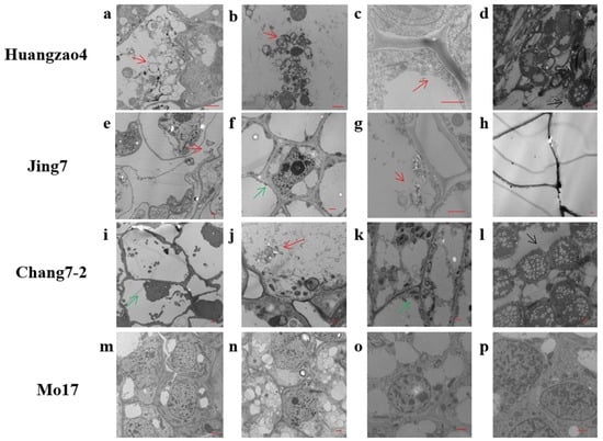 Cell structure analysis of three typical maize inbred lines and the resistant inbred line Mo17 at different growth stages. (a–d) Cells from Huangzao4 growth points or tassels after inoculation at the VE, V8, V12, and VT stages, respectively. (e–h) Cells from Jing7 growth points or tassels after inoculation at the VE, V8, V12, and VT stages, respectively. (i–l) Cells from Chang7-2 growth points or tassels after inoculation at the VE, V8, V12, and VT stages, respectively. (m–p) Cells from Mo17 growth points or tassels after inoculation at the VE, V8, V12, and VT stages, respectively. The ”-”scale is 1 μm. The red arrow indicates cell autophagy; the green arrow indicates plasmolysis.