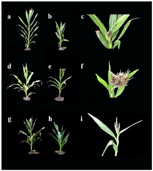 Using the three typical maize lines, two F2 populations (Huangzao4×Jing7 and Jing7×Chang7-2) were constructed based on three maize inbred lines, Huangzao4 (Figure 2a–c), Jing7 (Figure 2d–f), and Chang7-2 (Figure 2g–i). These plants showed different symptoms in the tassel of maize infected with Sporisorium reilianum. Phenotypic identification of F2 plants was performed according to the symptoms of tassels infected with Sporisorium reilianum. The statistical results are shown in Table 1. In the Huangzao4×Jing7 F2 population, there were 265 plants with Class A tassel symptoms, 234 plants with Class B tassel symptoms, and 890 plants with Class D tassel symptoms (Supplementary Figure S1a,b). In the Jing7×Chang7-2 F2 population, there were 146 plants with Class B tassel symptoms, 183 plants with Class C tassel symptoms, and 263 plants with Class E tassel symptoms (Supplementary Figure S1c). According to the chi-square test, the number of the parent phenotype and intermediate type did not follow a 1:2:1 ratio in each population. There were several intermediate individual plants in each F2 population, and it was difficult to divide them and classify the occurrence of the leafy tufted half spike (Figure 3a–c). These results demonstrated that these traits were not discrete gene characteristics, making the intermediate phenotype more difficult to distinguish.