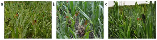 The soil was sieved through a 2 × 2 mm sieve and baked in an oven at 105 °C for 4–6 h. Water was then added, producing wet soil with an absolute moisture content of 20%. Full, uniformly sized seeds were disinfected with 1% sodium hypochlorite for 20 min and rinsed in distilled water five times for 4 h in a 37 °C water bath. The bottom of the paper tube was filled with 5 cm of wet soil, the seed embryo was placed face down on the soil, covered with about 2 g of 1% mycorrhizal soil of Sporisorium reilianum, and covered with about 2 cm of wet soil with an absolute moisture content of 20%. The seedlings were incubated in an artificial climate chamber at 20 °C with 8 h of light during the day, at 15 °C for 16 h at night, and then refined after 18 d. The seedlings were moved to the field at the V1 stage on 20 May 2017 []. The planting row spacing was 5 m, the distance between individual plants was 20 cm, and phenotypic investigation of each plant was conducted at the R3 stage.