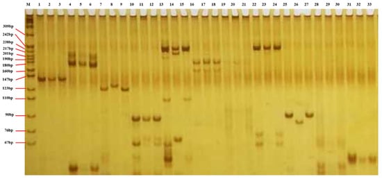 SSR marker screening among parents. Electrophoresis lanes: M is Marker pBR322 DNA/MspⅠ; the samples are from Huangzao4, Jing7, and Chang7-2, respectively; 1, 2, and 3 are bnlg1083; 4, 5, and 6 are bnlg1614; 7, 8, and 9 are bnlg1953; 10, 11, and 12 are umc1169; 13, 14, and 15 are bnlg1458; 16, 17, and 18 are umc1321; 19, 20, and 21 are umc1073; 22, 23, and 24 are umc1114; 25, 26, and 27 are phi078; 28, 29, and 30 are umc1944; 31, 32, and 33 are umc1095.