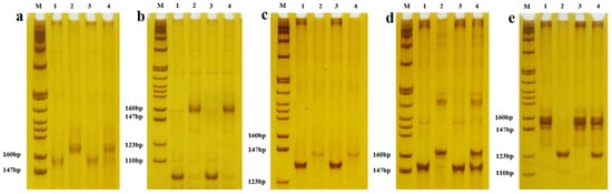 For the F2 populations of Huangzao4×Jing7, the mixed gene pools AB-A and AB-B were built with 15 lines of extreme A phenotypes and 15 lines of extreme B phenotypes, respectively. Three pairs of polymorphism primers, umc1601 (bin1.05), umc1590 (bin1.06), and umc1754 (bin1.06), were polymorphic between Huangzao4 and Jing7 males in mixture pools of extreme tassel symptoms (Figure 5a–c). For the F2 populations of Jing7×Chang7-2, the mixed gene pools BC-B and BC-C were built with 15 lines of extreme B phenotypes and 15 lines of extreme C phenotypes, respectively. Two pairs of polymorphism primers, bnlg1914 (bin2.05) and bnlg1335 (bin2.07), were polymorphic between Jing7 and Chang7-2 male mixture pools of extreme tassel symptoms (Figure 5d,e).
