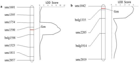 In this study, the BSA method was used to construct mixed pools based on the typical symptoms affecting the tassels of maize infected with Sporisorium reilianum, which were continuously distributed in the two F2 populations. A total of 15 lines with extreme phenotypes from the F2 population were selected and placed into mixed gene pools to screen for polymorphisms and reduce false positives. The genotypic identification of more than 200 F2 progenies from each population was sufficient to complete primary positioning []. Based on the advantage of the BSA method and the particularity of phenotype of tassel symptoms of head smut, two QTLs related to tassel symptoms of maize infected with Sporisorium reilianum were located.
