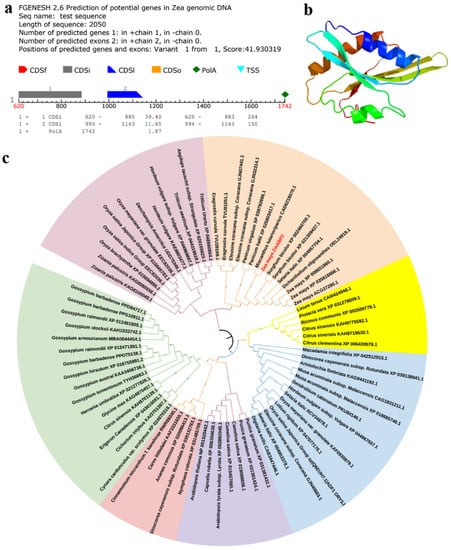 Bioinformatics analysis of the candidate gene ZmABP2. (a) Gene prediction of ZmABP2 gene (TSS: Transcription start site; CDSf: Start exon; CDSI: Terminal exon). (b) Tertiary structure of ZmABP2 protein. (c) Phylogenetic analysis of ZmABP2 protein.