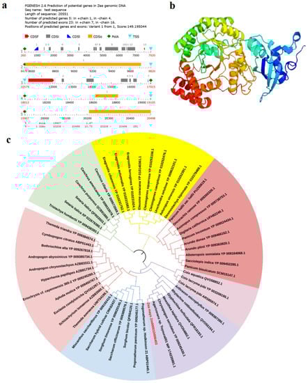 Bioinformatics analysis of the candidate gene Zm00001d006403. (a) Gene prediction of Zm00001d006403 gene (TSS: Transcription start site; CDSf: Start exon; CDSI: Terminal exon). (b) Tertiary structure of Zm00001d006403 protein. (c) Phylogenetic analysis of Zm00001d006403 protein.