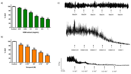 Effect of different concentrations of (a) H. stoechas extract (HSM) and (b) verapamil (V) on the spontaneous contractions in segments of the longitudinal smooth muscle of rat ileum. Data points are mean ± SEM (n = 6–8). ** p < 0.01 and *** p < 0.001 vs. control (basal spontaneous contractions). (c) Representative recordings of spontaneous contractions from cumulative concentration response curves of methanol (MeOH), HSM (0.01–3 mg/mL) and V (10−8–10−6 M). AUC: area under the curve.