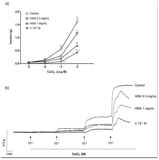 (a) Effect of H. stoechas extract (HSM, 0.3 or 1 mg/mL) and verapamil (V, 10−6 M) on the contraction produced by CaCl2 in rat ileum. (b) Representative recordings of spontaneous contractions from cumulative concentration of CaCl2 in strips pre-incubated with methanol (control), H. stoechas or verapamil. Data points are mean ± SEM (n = 6). * p < 0.05, ** p < 0.01 and *** p < 0.001 vs. control.