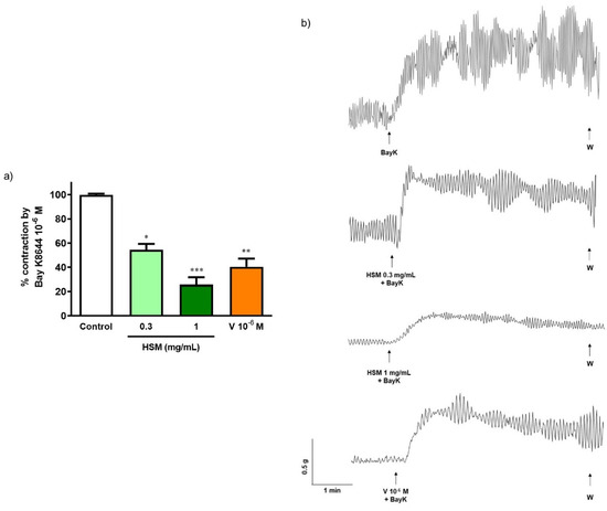 (a) Effect of pre-incubation with H. stoechas extract (HSM, 0.3 and 1 mg/mL) and verapamil (V, 10−6 M) on the contractile response produced by Bay K8644 (10−6 M) on rat ileum segments. (b) Representative recordings of contractions produced by Bay K8644 alone or in the presence of HSM or verapamil. Data points are mean ± SEM (n = 6–8). * p < 0.05, ** p < 0.01 and *** p < 0.001 vs. control (Bay K8644 alone).
