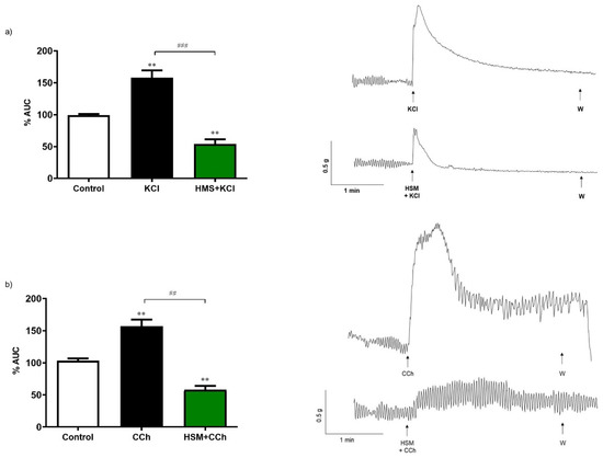 Contractile effect of (a) KCl (80 mM) and (b) carbachol (CCh, 10−6 M) on spontaneous contractions and effect of pre-incubation of H. stoechas extract (HSM, 1 mg/mL) on KCl or CCh-evoked contractile responses. Their representative recordings are showed on the right. Data points are mean ± SEM (n = 6). ** p < 0.01 vs. control (basal spontaneous contractions) and ## p < 0.01, ### p < 0.001 vs. KCl or CCh. AUC: area under the curve.