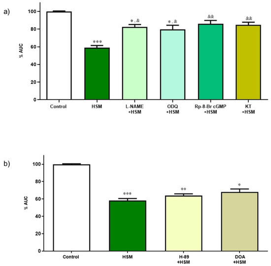 (a) Effect of inhibitors of the NO/cGMP/PKG pathway on the relaxant response induced by H. stoechas extract (HSM, 1 mg/mL) on the longitudinal smooth muscle of the rat ileum. (b) Effect of inhibitors of the cAMP/PKA pathway on the relaxant response induced by the HSM extract on the longitudinal smooth muscle of the rat ileum. Data points are mean ± SEM (n = 6–8). * p < 0.05, ** p < 0.01, *** p < 0.001 vs. control (basal spontaneous contractions) and & p < 0.05, && p < 0.01, vs. HSM. AUC: area under the curve.