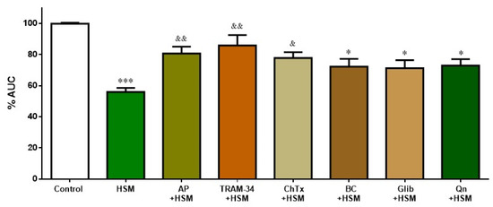 Effect of pre-incubation with L-NAME (10−5 M), TRAM-34 (10−6 M), apamin (AP, 10−6 M), and the combination of TRAM-34+AP and L-NAME+TRAM-34+AP on the reduction induced by H. stoechas extract (HSM, 1 mg/mL) on the longitudinal smooth muscle of rat ileum. Data points are mean ± SEM (n = 6–8). *** p < 0.001 vs. control (basal spontaneous contractions) and & p < 0.05, && p < 0.05, &&& p < 0.001 vs. HSM. AUC: area under the curve.