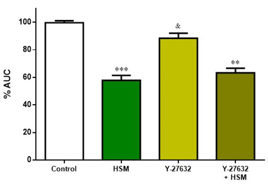 Effect of pre-incubation with H. stoechas extract (HSM, 1 mg/mL), Y-27632 (10−6 M) and the combination of Y-27632+HSM on the AUC from spontaneous contractions of rat ileum. Data points are mean ± SEM (n = 6–8). ** p < 0.01, *** p < 0.001 vs. control (basal spontaneous contractions), and & p < 0.05 vs. HSM. AUC: area under the curve.