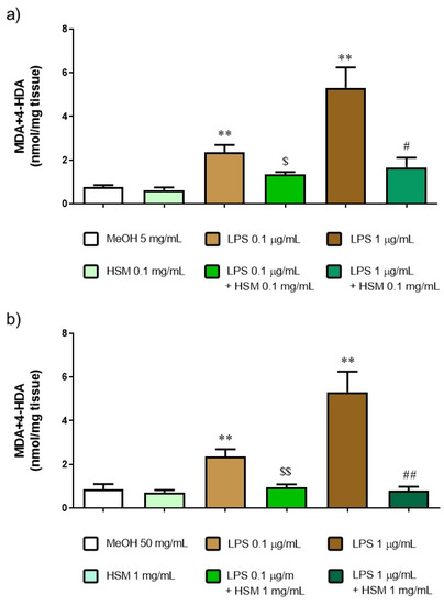 MDA+4-HDA concentration after incubation with MeOH or H. stoechas extract (HSM) at either (a) low or (b) high concentrations, in presence or absence of lipid peroxidation evoked by LPS 0.1 or 1 µg/mL on rat jejunum. Data points are mean ± SEM (n = 5). ** p < 0.01 vs. MeOH (control) and HSM, $ p < 0.05, $$ p < 0.01 vs. LPS 0.1 µg/mL and # p < 0.05, ## p < 0.01 vs. LPS 1 µg/mL.