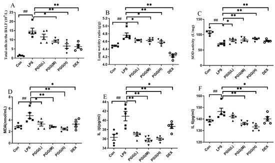 The lung injury score (LIS) was calculated to examine the histological changes in the PGG-treated ALI tissues (Figure 2G). The total surface score of the slides was based on four categories: alveolar congestion, hemorrhage, neutrophil infiltration and thickness of the alveolar wall. Each category was rated 0–4 as follows: 0 = no injury; 1 = 25% damage to the field; 2 = 50% injury field of the total surface; 3 = 75% of the field with injury; and 4 = diffuse damage [18]. The LIS at 12 h after the LPS perfusion was significantly increased (p < 0.01). However, the degree of the lung injury was significantly improved in the PGG (60 and 30 mg/kg)- and DEX-treated groups when compared with that in the LPS group (p < 0.01).