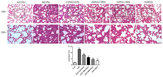 PGG alleviates LPS-induced pathological changes in lung tissue (n = 5). Representative lung tissue by hematoxylin-eosin (H&E) staining in each group (A–G). Lung tissue sections were stained with H&E for histopathologic analysis (magnification 100×, 200×, n = 5). Scale bar, 50 μm. (A) Control group, (B) LPS group, (C) PGG (LD) group, (D) PGGG (MD) group, (E) PGG (HD) group, (F) DEX group, (G) lung Injury Score. Values are expressed as the mean ± standard deviation (SD). ## p < 0.01 vs. Con group; * p < 0.05, ** p < 0.01 vs. LPS group. Con, control group; DEX, dexamethasone; LPS, lipopolysaccharide; PGG, 1,2,3,4,6-O-pentagalloylglucose; PGG (L), PGG (15 mg/kg) + LPS group; PGG (M), PGG (30 mg/kg) + LPS group; PGG (H), PGG (60 mg/kg) + LPS group.