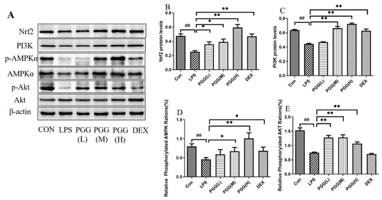 Nrf2, the core regulatory factor of the cell defense against various stress injuries, is also a key endogenous antioxidant pathway in the body. Following the induction of oxidative stress, Nrf2 rapidly enters the nucleus to initiate SOD activity, reducing the oxidative damage [33,34]. Nrf2 is phosphorylated at serine and threonine residues by kinases, including PI3K, which is beneficial for Nrf2 and its subsequent release translocation [35,36]. AMPK can activate the PI3K/Akt pathway, and the phosphorylation of AKT can further activate the Nrf2 nuclear translocation. In addition, it has been reported that the PI3K/Akt pathway is a putative regulator of the transcription factor Nrf2. The Western blot results also revealed that the expression of the Nrf2 protein was significantly higher in the PGG group (60 and 30 mg/kg) than in the LPS group (p < 0.05). The immunohistochemical and immunofluorescence results confirmed the Western blot findings.