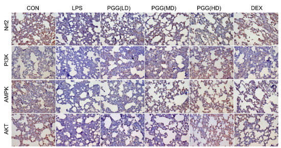 In particular, we analyzed the expression of AMPK, PI3K, Akt and Nrf2 proteins in lung tissues by immunohistochemical staining to elucidate the potential role of PGG in ALI rats. Compared with the control group, the expression of AMPK, PI3K, Akt and Nrf2 were significantly decreased under an LPS stimulation; these activities were significantly increased by the PGG treatment, especially in the PGG (30 and 60 mg/kg) groups (Figure 4). This result was consistent with the data obtained from the Western blotting analysis.