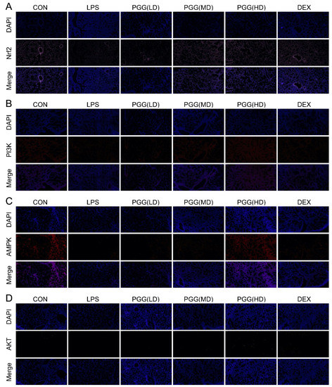 AMPK, as a sensor of the cellular energy status, regulates the cellular and systemic energy balance [23]. The activation of AMPK has been associated with antioxidant and anti-inflammatory effects in different models. Therefore, protein kinases play diverse roles in mediating cytoprotection against different cellular aspects [24]. A stimulation with specific activators could significantly inhibit the release of pro-inflammatory cytokines, suggesting that the activation of the AMPK protein could inhibit the process of a lung inflammation [25]. This effect may be regulated by transcription factors downstream of Nrf2 [26]. AMPK can activate the PI3K/Akt pathway, and the phosphorylation of Akt further activates the nuclear translocation of Nrf2 [27,28]. Herein, we observed that PGG (60 and 30 mg/kg) upregulated p-AMPK/AMPK expression (p < 0.05). The immunohistochemical and immunofluorescence results confirmed those of Western blot analysis.