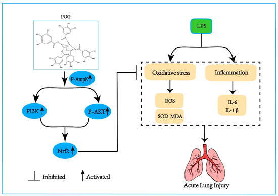 In summary, the candidate compound PGG can activate the AMPK/PI3K/AKT/Nrf2 antioxidant pathway to reduce the proinflammatory cytokines (IL-6 and IL-1β), the MDA formation and SOD consumption, further lowering the alveolar inflammatory cell infiltration and pulmonary edema, and ultimately ameliorating ALI (Figure 6).