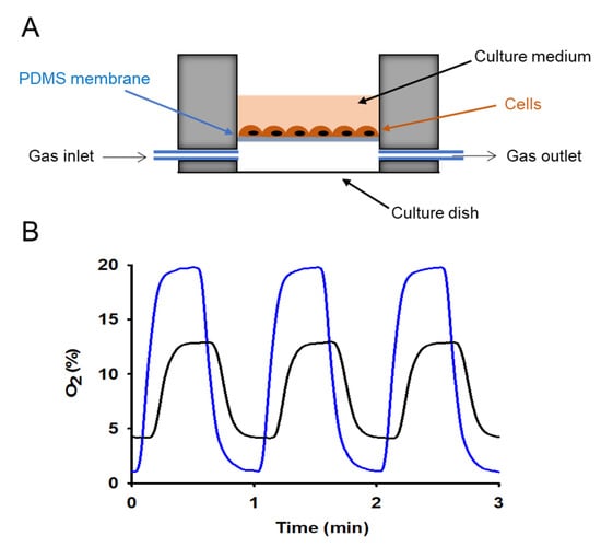 Experimental in vitro system for cellular exposures to constant or variable oxygen concentrations. (A) schematic view of the cell culture setting to apply controlled intermittent hypoxia (IH) to cultured cells (see text for explanation). (B) actual oxygen concentration measured on top of the membrane (cell culture level) when applying IH with different magnitudes (1–20% O2 (blue line) and 4–13% O2 (black line) at a frequency of 60 cycles/h. Reprinted with permission from Ref. []. 2017. American Physiological Society.