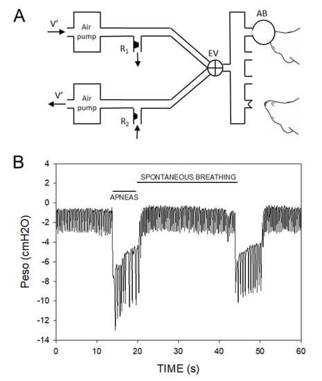 Model to apply airway obstruction mimicking sleep apnea. (A) Diagram of the system. V′: flow generated by both air pumps (reversed directions). R1 and R2: resistors. EV: three-way electrovalve. The resistance of R1 was greater than that of R2 to generate higher positive (30 cmH2O) than negative (−5 cmH2O) pressure. Four airbags were connected to the source of alternant pressure. For the sake of simplicity and illustration, the figure shows only two airbags in place: one inflated (30 cmH2O) to apply airway obstruction to the mouse (top) and the other one deflated (−5 cmH2O) to allow the mouse to breathe spontaneously. (B) Example of esophageal pressure (Peso) recording in one mouse during application of two of apneas (6 s each at a rate of 120/h). Reprinted with permission from Ref. []. 2011. Elsevier.