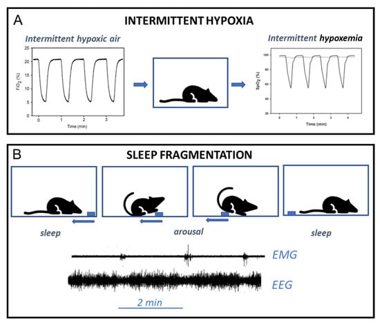 Diagrams of the most common experimental animal models of sleep apnea. (A) Application of intermittent hypoxia: air with cyclic O2 fraction (FiO2) in the animal cage induces recurrent hypoxemia (SaO2). (B) Induction of sleep fragmentation: smooth cyclic movement of a bar (blue) in the cage ground induces cyclic arousal, as reflected by electromyography (EMG) and electroencephalography (EEG) signals in the mice. See text for explanation. Reprinted from Ref. []. Creative Commons License.