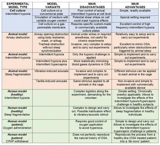 Due to the high prevalence of SA globally, nowadays an estimated 1 billion people being affected [], and because there are independent associations of SA with such a long and important list of morbid consequences, a variety of experimental models have been developed and extensively used to investigate the systemic and end-organ consequences induced by SA. These models cover a wide scale—cells, animals, humans—and an ample spectrum of challenges being tested—recurrent airway occlusion, intermittent hypoxia/hypercapnia, and sleep fragmentation. Whereas in some cases the models are focused on exploring a specific effect on a particular cell type—e.g., oxidative stress in endothelial cells—, other models attempt to investigate the whole pathophysiological response in animals or healthy humans when subjected to injurious challenges realistically mimicking those experienced by patients with SA []. As in all cases of biomedical research on complex diseases, each scale of experimental approach has its advantages and disadvantages. On the one hand, very fine-tuned in vitro experiments focused on one pathway in one cell type allow researchers to dissect the question posed in a very precise way, but at the cost of neglecting the considerable number of physiological interactions arising from the multiorgan in vivo complexity of SA consequences. Conversely, SA models in animals or humans allow investigators to gain a more general perspective of the in vivo consequences of the specific challenge under study, but with a reduced capacity to dissect the pathophysiological role played by each cell type, tissue and organ involved. Therefore, a better understanding of the pathophysiology of SA consequences will usually require combining the information obtained from all different experimental approaches and scales. Although this intellectual exercise may seem relatively simple, the vast complexity of the pathophysiological processes in a disease involving multiorgan alterations has clearly hampered our ability to identify and modify the causal pathways underlying SA-associated morbidities []. Here, we describe the different cellular, animal, and human experimental models employed in research aiming to elucidate the consequences of SA, while also indicating their advantages, limitations, and potential improvements.