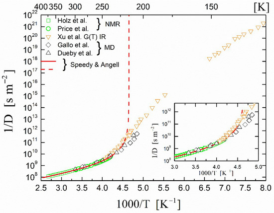 - Gillen, K.T.; Douglass, D.C.; Hoch, M.J.R. Self-Diffusion in Liquid Water to −31 °C. J. Chem. Phys. 1972, 57, 5117–5119. [Google Scholar] [CrossRef]