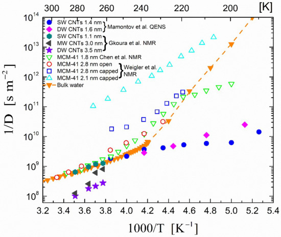 ), and stars (★) are the D values of H2O confined in SW 1.1 nm, MW 3.0 nm, and DW 3.5 nm, respectively, acquired via 2D D-T2 static field gradient NMR experiments (Gkoura et al. [74]). Inverted open triangles (▽) are the self-diffusion coefficients obtained from the pulsed field gradient NMR experiments of water confined in MCM-41 (Chen et al. [75]). Open circles (◯), open squares (□), and open upright triangles (△) are the self-diffusion coefficients obtained from static field gradient NMR experiments on water in open 2.8 nm, capped 2.8 nm, and capped 2.1 nm MCM-41 samples, respectively (Weigler et al. [76]).