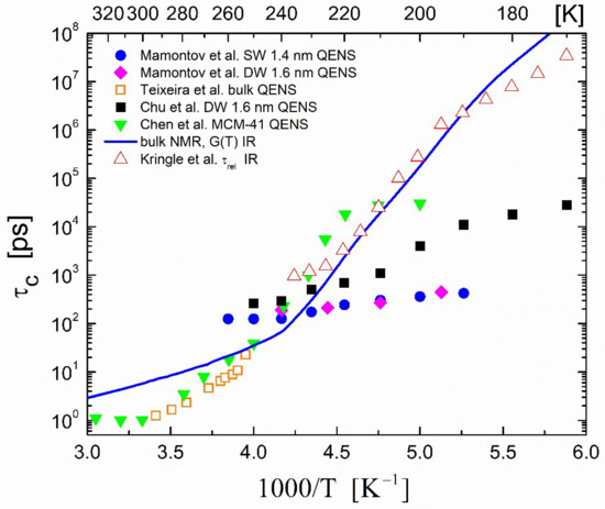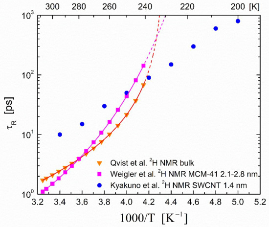 - Weigler, M.; Brodrecht, M.; Buntkowsky, G.; Vogel, M. Reorientation of Deeply Cooled Water in Mesoporous Silica: NMR Studies of the Pore-Size Dependence. J. Phys. Chem. B 2019, 123, 2123–2134. [Google Scholar] [CrossRef] [PubMed]