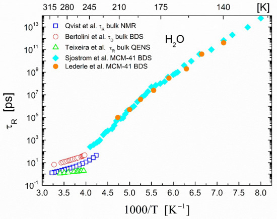 - Qvist, J.; Mattea, C.; Sunde, E.P.; Halle, B. Rotational dynamics in supercooled water from nuclear spin relaxation and molecular simulations. J. Chem. Phys. 2012, 136, 204505. [Google Scholar] [CrossRef] [PubMed]