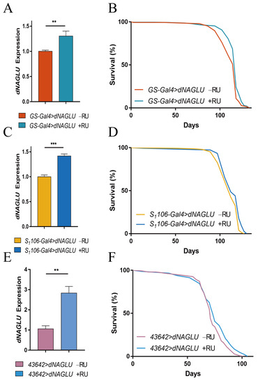 Effects of dNAGLU overexpression on the lifespan in Drosophila: (A) qRT-PCR validation for expression of dNAGLU in Drosophila whole body; (B) survival curves of Drosophila overexpressing dNAGLU in the whole body, p = 0.0004; (C) qRT-PCR validation for expression of dNAGLU in Drosophila fat body; (D) survival curves of Drosophila overexpressing dNAGLU in the fat body, p = 0.0008; (E) qRT-PCR validation for expression of dNAGLU in Drosophila nervous system; (F) survival curves of Drosophila overexpressing dNAGLU in the nervours system, p = 0.0195. A 5% or lower p value is considered to be statistically significant using Student’s t-test, ** p < 0.01, *** p < 0.001. All survival data were analyzed with the log-rank test.