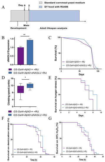 Effects of dNAGLU overexpression on the lifespan in Drosophila AD models: (A) Experimental timeline for feeding adult flies to experimental diets; (B) qRT-PCR validation for expression of dNAGLU in AD flies (** p < 0.01, t-test); (C) survival curves of Drosophila overexpressing dNAGLU in AD flies (p = 0.0004, log-rank test); (D,E) effects of dNAGLU overexpression on stress tolerance in AD flies; (D) climbing assay, (* p < 0.05, t-test); (E) hunger stress assay, (p < 0.0001, log-rank test); (F) desiccation stress assay, (p = 0.0018, log-rank test); (G) H2O2 stress assay, (p = 0.1850, log-rank test).