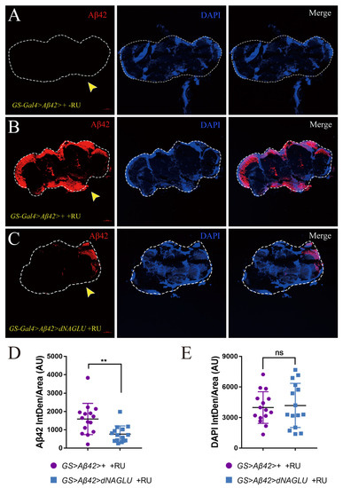 Since lysosomal dysfunction is a common abnormality in neurodegenerative diseases, which leads to impaired Aβ clearance [34], we attempted to determine whether dNAGLU could improve fly fitness and stress resistance by promoting Aβ clearance. We dissected the mushroom bodies of 50-day-old flies for cryo-sectioning and performed immunofluorescence staining to observe the deposition of Aβ42 in the brain tissue of these flies. We used GS-Gal4>Aβ42>+ −RU flies (Figure 4A), which did not induce Aβ42 expression, as the negative control, and used GS-Gal4>Aβ42>+ +RU flies (Figure 4B), the Drosophila AD model, which induces ubiquitous Aβ42 expression, as the control. We used GS-Gal4>Aβ42>dNAGLU +RU flies (Figure 4C), which induce the overexpression of dNAGLU in the Drosophila AD model, as the experimental group.