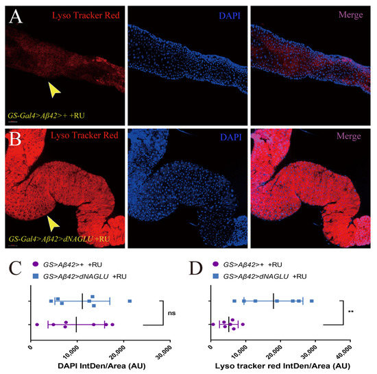 Overexpression of dNAGLU in AD Drosophila enhances intestinal lysosomal activity: (A,B) Immunofluorescence using Lyso Tracker Red in Drosophila guts. (A) GS-Gal4>Aβ42>+ +RU flies; (B) GS-Gal4>Aβ42>dNAGLU +RU flies; (C) the integrated density of Lyso Tracker Red/area are shown as bar plots (n = 7, p = 0.0024, t-test); (D) the integrated density of DAPI/area are shown as bar plots (n = 7, p = 0.6908, t-test). The nuclei are stained with DAPI in blue. ** p < 0.01, ns represents non-significant.
