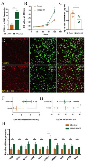 Effects of NAGLU overexpression in human U251-APP cells: (A) qRT-PCR validation for expression of NAGLU in U251-APP cells (*** p < 0.001, t-test); (B) cell proliferation curve for NAGLU over-expressing cells detected by cell counting assay (* p < 0.05, ** p < 0.01, t-test); (C) detection of Aβ42 concentration in cell supernatants by ELISA (* p < 0.05, t-test); (D,E) immunofluorescence using Lyso Tracker Red in cultured cells; (D) U251-APP cells; (E) NAGLU overexpressing U251-APP cells; (F) the integrated density of Lyso Tracker Red/area are shown as bar plots (n = 4, p = 0.0209, t-test); (G) the integrated density of copGFP/area are shown as bar plots (n = 4, p = 0.8375, t-test). * p < 0.05, ns represents non-significant; (H) relative mRNA levels of genes involved in Aβ degradation and lysosomal pathway (* p < 0.05, ** p < 0.01, t-test). (OE represents overexpression.)