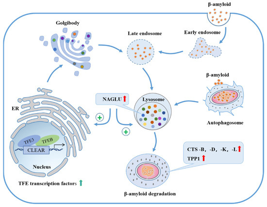 NAGLU is located in lysosomes and is an important glucosidase in the lysosomal pathway. The autophagy-lysosome pathway degrades and recycles cellular components, including toxic protein aggregates and damaged organelles [38]. Growing evidence suggests that lysosomal dysfunction plays a key role in the development of AD. Impaired clearance of Aβ is a potential mechanism of widespread sporadic AD [8]; thus, the health and survival of neurons in the brain depend on the normal lysosomal function [39]. Lysosomal dysfunction is associated with aging, and blockade of autophagic flux may result from lysosomal damage [35]. Our study described herein suggests that NAGLU may have a wider role, as we demonstrated here, that in AD flies, as well as in cultured cells, NAGLU could enhance the lysosomal activity and promote lysosomal biogenesis.