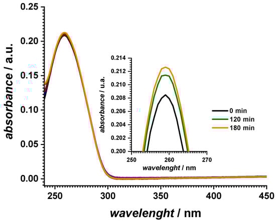 The UV spectra of the fresh dsDNA sample showed the typical absorption band at 260 nm, as shown in Figure 1. Exposure to the solar simulator for different times led to a small hyperchromic effect of an approx. 1% increase in the initial absorbance values, which was related to the unwinding of the double helical structure upon UV irradiation. A control experiment of a dsDNA solution without exposure to the solar simulator did not show any variation in the absorbance value in this time interval.