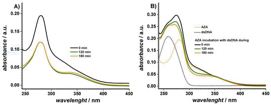 The UV spectra of the AZA-dsDNA samples were recorded after different times of exposure to the SS, as shown in Figure 2B. The spectra at a 0 min incubation time showed both the DNA and AZA absorption bands, although a blue shift (approx. 3 nm) was observed for the AZA band, proving that an interaction between the dsDNA and AZA occurred through the imidazole moiety. With increasing the exposure time to the SS, a continuous decrease in the absorbance of AZA at 277 nm occurred accompanied by the appearance of a band at 334 nm due to the cleavage of AZA. Nonetheless, the DNA absorption band practically maintained the same absorbance value and position, as shown in Table 1.