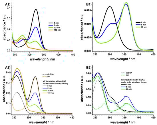 The UV spectra of the MP were recorded after different times of exposure to the solar simulator, as shown in Figure 3(A1). At 0 min, a maximum at 322 nm was observed, which progressively decreased with increasing the exposure time. At the same time, a new absorption band occurred at 274 nm, which was attributed to the MP degradation product. The interaction of MP with dsDNA was also investigated during exposure to the SS, as shown in Figure 3(A2). The spectrum recorded at a 0 min exposure time showed a clear hyperchromic effect at 260 nm, as shown in Table 1, which indicated a conformational modification within the DNA structure. By increasing the irradiation time, the MP adsorption band at 322 nm decreased and the increase at 260 nm was due to both the DNA and MP degradation products.
