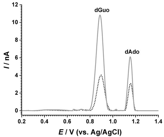 Initial measurements were recorded for the dsDNA samples before and after exposure to the solar simulator, as shown in Figure 4. The DP voltammograms showed the oxidation peaks of guanine at Epa = +0.89 V and adenine at Epa = +1.15 V. An increase in the peak currents was identified after sample irradiation [], and this effect was associated with the conformational modifications the double helix, which led to the exposure of the bases at the electrode surface, facilitating their oxidation []. Control experiments were also performed, and a solution of dsDNA was held in the same conditions without exposure to the solar simulator; however, no modification of the peak currents was observed during the timeframe of the experiment.