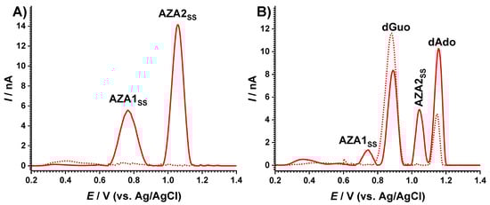 The effect of AZA degradation on DNA was also investigated in incubated solutions, as shown in Figure 5B. The DP voltammogram of the fresh AZA-dsDNA sample in a positive potential range revealed the typical oxidation peaks of desoxyguanosine (dGuo) and desoxyadenosine (dAdo) at EdGuo = +0.88 V and EdAdo = +1.15 V, demonstrating that the immunosuppressive drug AZA did not induce a modification in the electrochemical response of the DNA. Upon irradiation, the voltammogram showed both peaks corresponding to the AZA degradation products, DAZA1 and DAZA2, as well as those corresponding to DNA oxidation, dGuo and dAdo. Nonetheless, the modification of the dsDNA peak currents and the potential values observed on the voltammogram recorded for the irradiated AZA-dsDNA sample, when compared to the standard dsDNA irradiated solution, indicated that a conformation/structural modification of dsDNA occurred during the AZA degradation. A decrease in the dGuo current and a potential shift to more positive values was observed. Regarding the dAdo oxidation potential, a similar potential shift was also observed, but the current increased. Taking into consideration previous investigations on the interaction mechanisms of AZA and its redox products with dsDNA [], the behavior described above was explained considering the formation of adducts between the guanine residues of DNA and the AZA metabolites in the reaction that impeded their oxidation, which explained the decrease in the dGuo peak. At the same time, this interaction mechanism induced a distortion of the dsDNA double helix, exposing the bases to the electrode surface and consequently increasing in their oxidation currents, as observed for the dAdo peak current.